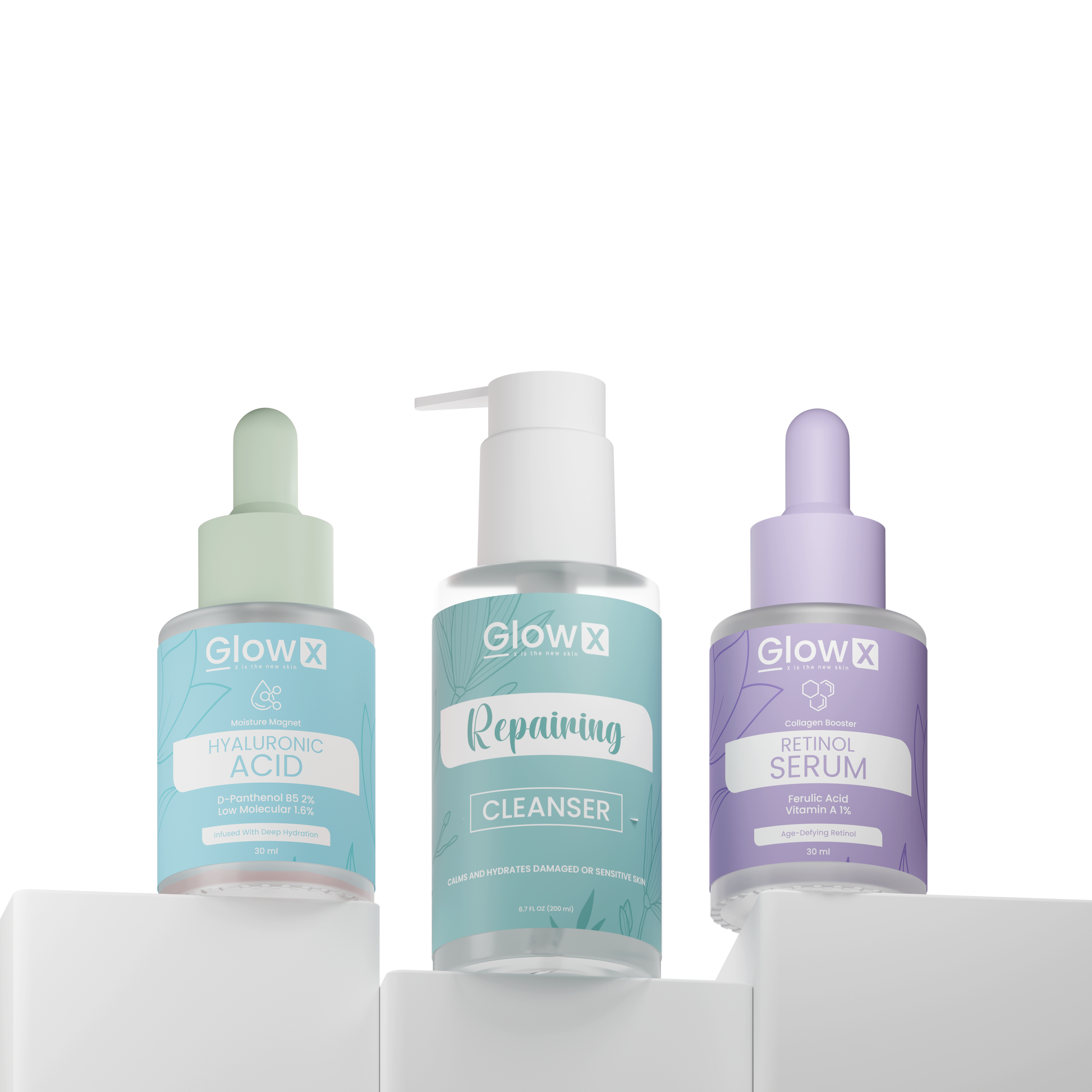 Glowx Anti Aging Kit combines three clinically-proven ingredients to address fine lines, loss of elasticity, and skin texture. Hyaluronic acid delivers deep hydration and plumps the skin, while retinol stimulates collagen production to reduce visible signs of aging. The repairing cleanser gently removes impurities without compromising your skin barrier. This comprehensive bundle works synergistically to restore firmness, clarity, and a youthful glow. Ideal for mature skin seeking professional-grade results at home.